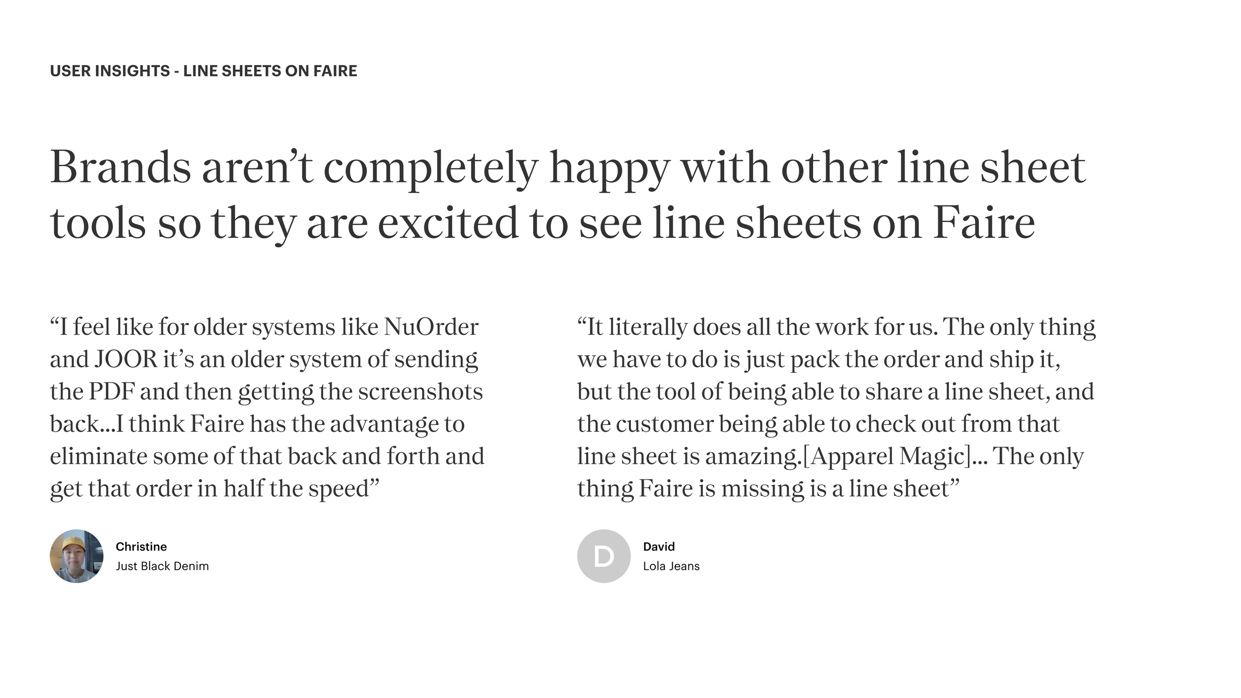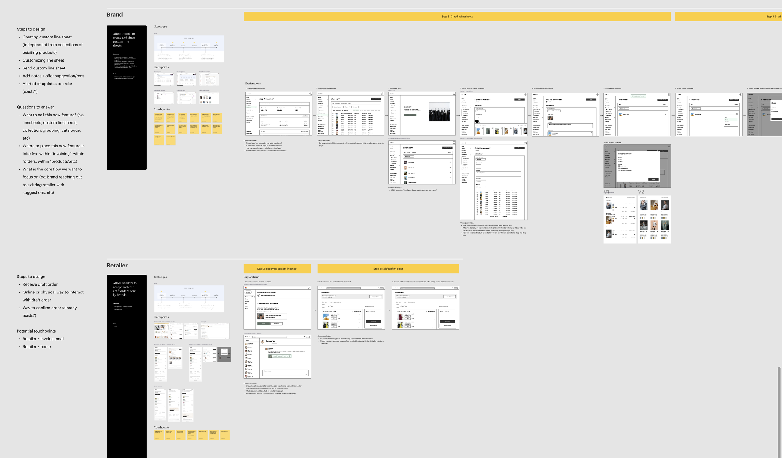 To begin, my Product Manager and I ran user interviews with a handful of apparel brands on Faire to learn more about their experience on Faire as well as their experience using line sheets on other platforms. We learned about the features they enjoyed on other platforms and what could be improved if we brought the line sheet experience to Faire.