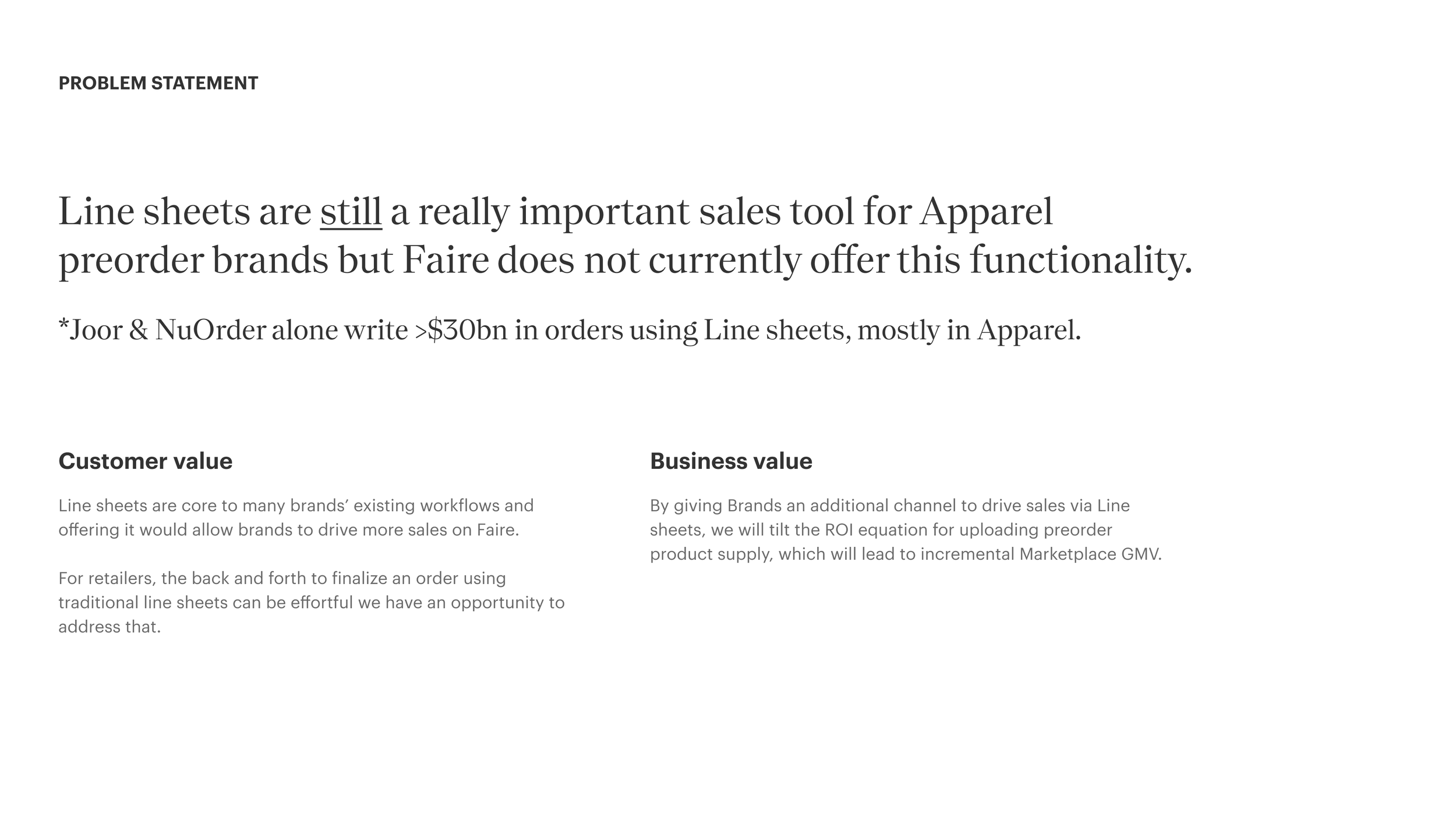I was brought onto Faire, a wholesale marketplace, to work on their apparel team to improve the user experience for their apparel brands and retailers. When looking at the apparel experience on the Faire platform, we saw some gaps in what Faire was lacking.